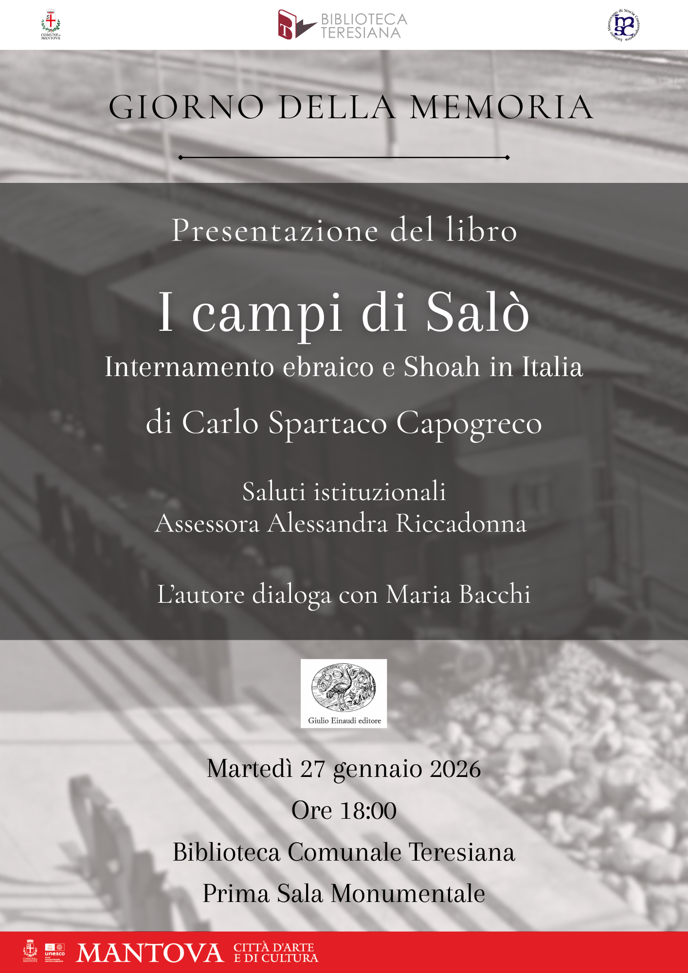 Martedì 27 gennaio 2026, Giorno della Memoria, la Biblioteca Comunale Teresiana in collaborazione con l’Istituto Mantovano di Storia Contemporanea ospita alle ore 18:00, in Prima Sala Monumentale, la presentazione del libro di Carlo Spartaco Capogreco “I campi di Salò. Internamento ebraico e Shoah in Italia”, pubblicato da Einaudi nel 2025.